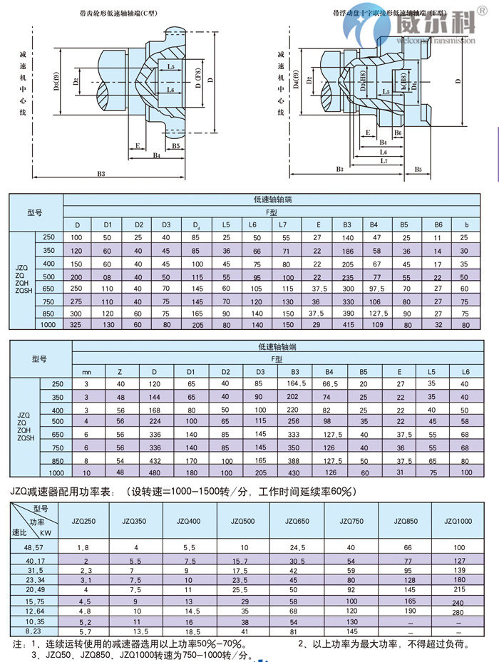 JZQ250齒輪減速機應用范圍及結構概況 1、應用范圍及優點: 本機廣泛應用于各種起重、運輸、礦山機械及其它各種機械中作減速之用。其聯動方式,可用聯軸器直接聯動,也可用三角皮帶撓性聯動。 本機通用性和互換性強,維修簡單,效率系數為0.94,具有起動阻力小,運動靈活等優點。 2、結構概況及主要零部件: 本機結構型式為兩級三軸圓柱斜齒水平分割全封式。潤滑油盛于減速機之內部,在主動軸和中間軸上設有擋油板,各軸支點均用滾動軸承,其軸向間隙,可用內部調整環調整之,本機上部有一檢查蓋,下部有油標指針和排廢油用的油塞。